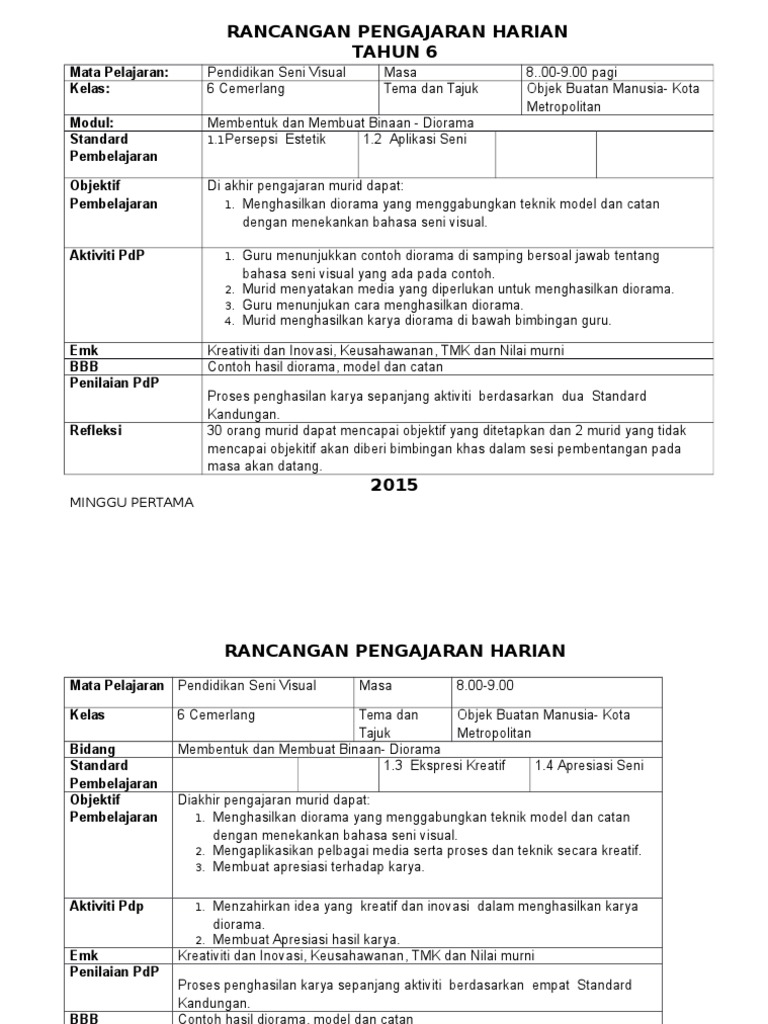 Doc Rancangan Pengajaran Harian Pendidikan Seni Visual Bil Perkara Dyana Nonong Academia Edu