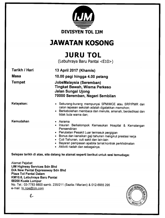 Temuduga Ijm Highway Services Sdn Bhd 13 April 2017 Blog Jobsmalaysia Negeri Sembilan