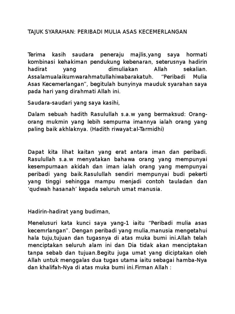 Sidang jemaah yang dirahmati allah kelahiran nabi muhammad saw dan perutusan baginda saw sebagai rasulullah adalah bukti teragung betapa luasnya rahmat allah swt kepada seluruh alam. Hari ini ramai tokoh yang lahir tampil untuk membuat kita kagum namun personaliti rasulullah saw dan kebijaksanaan baginda jauh lebih hebat hatta telah membawa perubahan kepada dunia seluruhnya sejak lebih 1 400 tahun yang lalu. Contoh teks syarahan assalammualaikum warahmatullahi wabarakatuh bismillah alhamdulillah. Makan minum tidur berkahwin dan mempunyai anak.